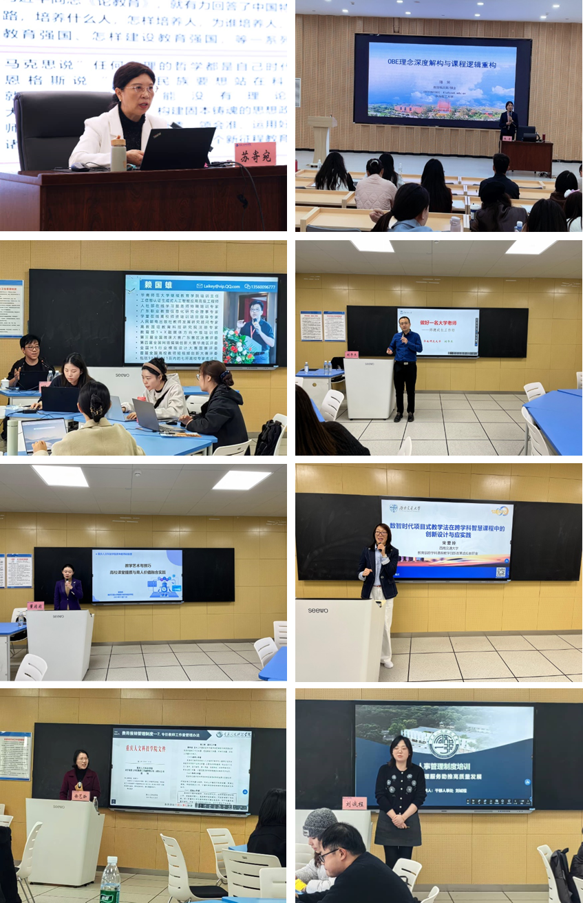 本次训练营还特邀教育部“全国师德师风建设暨高校师德师风建设专家委员会”委员、北京市人民政府督学、北京市委宣讲团成员、首都师范大学教师工作部部长苏寄宛,华南理工大学教务处教育技术中心教授陆芳,华南师范大学教授赖国雄、刘华杰,重庆交通大学教授董莉莉,西南交通大学教授宋爱玲,以及学校财务处处长徐艺珈、干部人事处副处长刘诚程等校内外专家作专题培训。授课内容涵盖师德师风建设、教育家精神与教师职业发展、OBE理念下的教学设计、AI工具赋能课堂教学、教学艺术与技术融合、学校管理制度解读等多个主题,兼具理论高度与实践指导意义,为新教师传道授业解惑,有效助推新教师的专业素养与教学能力。